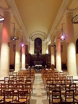 Der dreischiffige Bau aus Ziegelmauerwerk wurde nach Plänen des Architekten Jean-Baptiste Chaussard errichtet. Das Mittelschiff mit sechs Jochen, das mit sechs Säulen von den Seitenschiffen abgetrennt wird, schließt mit einem Tonnengewölbe ab. Der rechteckige Chor ist im Verhältnis zur Größe der Kirche klein ausgefallen.