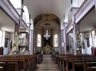 Das Langhaus ist eine Stufenhalle mit flach gedecktem Seitenschiffen und Tonnengewölbe im Mittelschiff. Hohe quadratische Säulen tragen die Rundbogenarkaden. In beiden Seitenschiffen sitzen Emporen, die das letzte Joch aussparen, wodurch der Eindruck eines Querhauses entsteht. Lisenen gliedern die Wände der Seitenschiffe. Pilaster sitzen in den Ecken des Chores. Der untere Teil des Chores ist vertäfelt. Auf der linken Seite des Chores sind Reste einer Wandbemalung zu erkennen. In der flachen Decke des Chores sitzt ein Vierpass aus Stuck, in dem ein Deckengemälde mit Christusdarstellung zu finden ist. Die Wand über dem Triumphbogen ist ebenfalls ausgemalt, im Zentrum sitzt ein hölzernes Kruzifix.