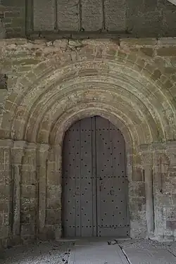 Von der Kirche des 12. Jahrhunderts ist das romanische Westportal erhalten. Das Rundbogenportal wird von schlichten Archivolten gerahmt, die auf schlanken, mit Kapitellen verzierten Säulen aufliegen. Auf den Kapitellen sind stilisierte Blätter, Vögel und eine kniende Person dargestellt.