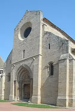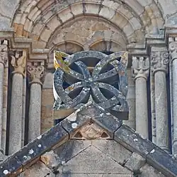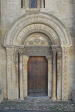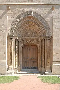 Das Hauptportal in der Fassade besitzt figürlichen Schmuck an Sturz und Tympanon; die Säulen und Archivolten sind von kleinteiligen geometrischen Mustern gleichsam eingesponnen. In dreifach gestufte Gewände sind schlanke Säulen eingestellt. Die äußeren sind spiralförmig gedreht, die inneren dicht mit einem Teppich von Blumenrosetten bestückt. Sie sind mit skulptierten Kapitellen, profilierten Basen und mehrfach gestuften Plinthen ausgestattet. Die äußeren Kapitelle sind Blattkapitelle, das linke innere ist mit feingliedrigem Pflanzenwerk skulptiert. Das rechte innere zeigt eine ziegenbärtige hockende Person, unter deren kurzem Rock ein gewaltiges männliches Geschlechtsorgan hervorlugt. Auf den Säulen stehen spitzbogige Archivoltenbögen aus Rundprofilen. Der innere Bogen ist wie die zugehörigen Säulen mit Blumenrosetten bedeckt, der äußere ist spiralförmig gedreht. Die Archivoltenbögen werden außenseitig von schlichten schlankeren Rundprofilen und tiefer liegenden flachen Keilsteinen begleitet, der innere Archivoltenbogen innenseitig von einem Rundprofil. Mehrfach profilierte Kämpferplatten markieren die Höhe der Bogenansätze. Ihre Profile werden als Trennung zwischen Architrav und Tympanon eingesetzt und auswärts um die Pilaster herumgeführt. Den äußeren Portalrahmen bilden rechteckige Pilaster. Das Dekorationsmotiv der Oberflächen ist ein doppeltes Band eines Flechtwerks aus diagonal über Kreuz geführten Bändern. Die Skulptur der Kapitelle ist rein pflanzlich. Über den Kämpfern steigt ein Spitzbogen auf in Breite und Gestaltung der Pilaster. Dieser Bogen wird noch einmal überfangen von einem Profil, in dem zwei Bänder sich überschneiden und eine fortlaufende Reihe von spitz-ovalen Mandelformen bilden. Die Zwischenräume sind mit Pinienzapfen gefüllt. An den Bogenenden stehen kleine Pinienzapfen, im Scheitel erscheint ein Relief des Lammes Gottes.