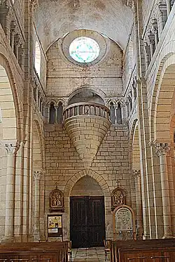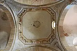 Die quadratische Vierung wird von den vorstehend beschriebenen vier gleich großen Arkaden umschlossen. Knapp über den Scheiteln der äußeren Keilsteinbögen befindet sich ein waagerecht verlaufendes Kragprofil, das ein Achteck umschließt, aus vier langen und vier kurzen Seiten. Die kurzen Seiten befinden sich um 45 Grad abgeschwenkt über den Ecken des Vierungsquadrats. Die dort im Grundriss entstandenen Dreiecke werden von den so genannten Trompen getragen, die unterseitig die Hohlform eines Kegelviertels aufweisen, die aus speziell zugeschnittenen Keilsteinen gebildet werden. Über dem Kragprofil beginnt ein Tambour, aus acht senkrechten Wandabschnitten. Innenseitig dieser Wände ist eine rundum durchlaufende rundbogige Blendarkatur angebracht. Auf den langen Seiten wird jeweils eine große Arkade von zwei mittelgroßen flankiert. Auf den kurzen befinden sich zwei kleine Arkaden. Die benachbarten Keilsteinbögen stehen jeweils gemeinsam auf Säulchen, in den acht Ecken auf im Querschnitt um 45 Grad abgeknickte Pilaster, die alle mit skulptierten Kapitellen, profilierten Kämpfern und Basen ausgerüstet sind. In drei der größten Arkaden sind rundbogige Fensteröffnungen ausgespart, in der vierten öffnet sich eine gleich große Aussparung in das Mittelschiff. Unmittelbar über den höchsten Bogenscheiteln wird der Tambour durch ein weiteres Kragprofil abgeschlossen, das gleichzeitig den Rand der achteckigen Kuppelwölbung bildet. Die Zwickel zwischen den Keilsteinbögen sind oberflächenbündig vermauert. Von den acht Ecken steigen zunächst leichte negative Grate auf, die weiter aufwärts in eine halbkugelige glatte Oberfläche übergehen. Im Scheitel der Kuppel befindet sich eine kreisrunde Öffnung zum Vertikaltransport von Glocken, Werkzeugen und Baumaterial.