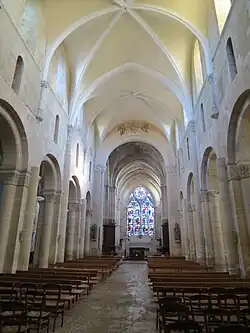 Die dem heiligen Hildevert, einem Bischof von Meaux, geweihte Kirche wurde an der Stelle einer im 10. und 11. Jahrhundert errichteten Vorgängerkirche erbaut. Der 48 Meter lange und 27 Meter breite Bau, als Stiftskirche errichtet, besitzt ein Hauptschiff mit sechs Jochen, das von zwei Seitenschiffen flankiert wird. Das Querhaus sowie der dreijochige Chor mit einem flachen Schluss sind größtenteils aus dem 12. Jahrhundert. Das 1875 restaurierte Mittelschiff stammt aus der ersten Hälfte des 12. Jahrhunderts wie auch der größte Teil des Querhauses. Das 28 Meter lange Hauptschiff wird im Erdgeschoss aus massiven, doppelt gestuften Rundbogenarkaden gebildet. Die breiten Obergadenfenster sind schmucklos ausgeführt. Der Turm über der Vierung wurde im Jahr 1649 abgerissen.