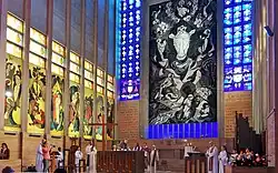 - An der Rückwand des Altarraums befindet sich die riesige, auf Gips gemalte Verklärung des Herrn in Schwarz, Weiß und Grau desselben Künstlers. Die einfache Farbwahl harmoniert mit den sie umgebenden lebhaften Farben aller anderer Elemente des Dekors.