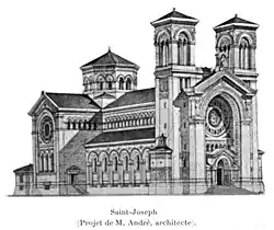 Nach Gründung der Pfarrei 1872 wurde von 1886 bis 1888 der Bau einer Pfarrkirche mit Krypta durch den Architekten Gaspard André geplant und durchgeführt. In den 1930er Jahren wurde sie durch Louis Mortamet (1897–1956) vergrößert. André schwebte das Vorbild der byzantinischen Kirchen von Ravenna vor. Konzipiert war sie als dreischiffige Basilika mit Doppelturmfassade, einem Querschiff und einem polygonalen Turm über der Vierung. Weder die Fassadentürme und der Vierungsturm noch die vorgesehenen Mosaikverkleidungen und das Apsismosaik konnten realisiert werden. Die Kirche beeindruckt bei spärlicher Ausstattung durch ihre Ausmaße.
