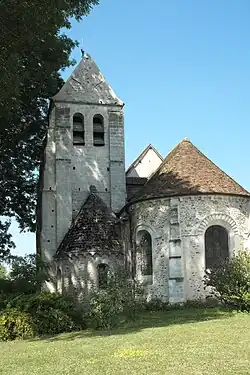 Der über quadratischem Grundriss errichtete Glockenturm wird an den Ecken von Strebepfeilern gestützt. Er ist mit einem Satteldach gedeckt und wird im Obergeschoss auf allen vier Seiten von großen, rundbogigen Klangarkaden durchbrochen. An der Südwestecke ist ein runder Treppenturm angebaut. Von den beiden seitlichen Apsiden ist nur noch die südliche erhalten. Sie wird von Steinplatten gedeckt und ist mit einem Steinkreuz mit drei konzentrischen Kreisen bekrönt. In die größere Mittelapsis, die von mehrfach abgetreppten Strebepfeilern gegliedert wird, sind drei große Rundbogenfenster eingeschnitten.