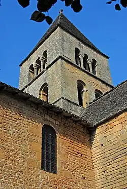 Der Turm besteht aus einem Sockel, dessen schmales Kraggesims von den Firsten der Querhausarme und des Chors um circa 50 cm überragt wird. Er wird darüber verlängert um zwei nicht sehr hohe Geschosse, die untereinander von einem doppelt profilierten Kraggesims unterteilt werden. In diesem Bereich befindet sich im Innern die Glockenstube. Im unteren Geschoss stehen auf dem Gesims auf jeder Turmseite zwei schlanke rundbogig überdeckte Fensteröffnungen auf, mit einem dreiseitigen Kantenrückversatz und einfach profilierten Kämpfern am Bogenübergang, die denen innerhalb der Vierung ähneln. Im gleich hohen Geschoss darüber stehen die Fensteröffnungen wieder auf dem Gesims auf, hier sind es jedoch jeweils drei, etwas kleiner als die darunter. Die drei Bögen sind arkadenförmig gereiht und werden untereinander durch schlanke zylindrische Säulenpaare (hintereinander) mit skulptierten Kapitellen getrennt. Diese Formgebung deutet auf eine spätere Erhöhung des Turms um dieses Geschoss hin. Der Turmhelm wird abgedeckt durch ein um 50 Grad geneigtes Kegeldach, dessen First von einem steinernen lateinischen Kreuz gekrönt wird.