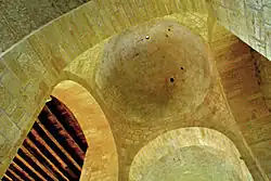 Die Querhausarme werden von Tonnengewölben in deren Längsrichtung überdeckt. Die Vierung wird von einer Halbkuppel überwölbt, mit einem Durchmesser, in Seitenlänge des inneren Quadrats der Vierung. Von den Ecken der Vierung leiten vier Pendentifs (Hängezwickel) zum höheren kreisrunden Rand der Kuppel über. Das Langhaus wird von je einem Fenster in den Giebelwänden seiner Arme direkt belichtet.