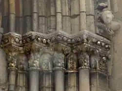 Entsprechend der Schiffeinteilung im Inneren wird die Westfassade durch Strebepfeiler in fünf Abschnitte gegliedert. In der Mitte öffnet sich ein spitzbogiges Stufenportal. Darüber liegt eine Gruppe dreier gleich hoher Fenster, fast ein Koppelfenster, da den schmalen Wandstücken zwischen ihnen jeweils nur ein einziger Rundstab vorgesetzt wurde. Die Säulen sind mit Blattkapitellen verziert, die äußerste Archivolte ruht auf beiden Seiten auf einer Konsole in Form einer Büste.
