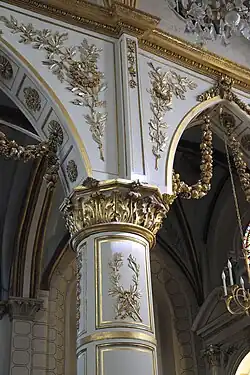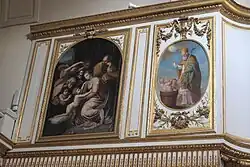 - Die Wände des Langhauses und des Chors sind mit einer weißen Holztäfelung verkleidet, die mit vergoldetem Stuck verziert ist. In die Wandtäfelung integriert sind in goldene Rahmen gefasste Gemälde von Jean-Bernard Restout (1732–1797) und Johann-Michael Baader (1736–1792).