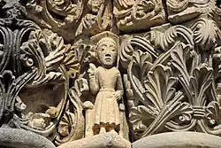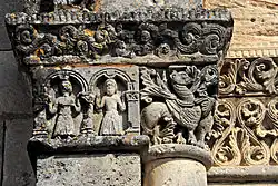 Im ersten Obergeschoss bestehen die fünf Blendarkaden aus einfachen halbkreisförmigen Bögen der Archivolten, aus glatten Keilsteinen, mit Umfassungen aus schmalen auskragenden ornamentierten Profilen. Die Archivolten sitzen beidseitig auf je zwei schlanken Säulen mit figural gestalteten Kapitellen und Kämpfern.