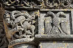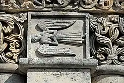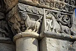 Von Bedeutung sind die figuralen und pflanzlichen Skulpturen der Kapitelle und des Bandes zwischen den Kapitellen des Erdgeschosses und die beiden Monumentalreliefs über den Scheinportalen. Folgende Motive sind zu erkennen (von linker zur rechten Fassadenecke): zwei Arkaden mit männlicher Person, ein Schwert im Gürtel, und weibliche Person / geflügelter Vierbeiner / Rankenwerk / zwei Personen und ein Tier / Engel fliegend mit großer und kleiner Person / Rankenwerk / Monster mit Vogel / zweiköpfiger Phönix in liegendem Rechteck / Person mit zum Segensgestus erhobener Hand / Rankenwerk / Portal / Rankenwerk / Vogel in Ranken / Engel mit ausgebreiteten Flügeln und gefalteten Händen, im Querformat, in liegendem Rechteck / Rankenwerk / Person reitend / Löwen / Pferd. einer Mandorla von Engeln gegen Himmel getragen werden, in der linken die Muttergottes, in der rechten der Patron der Kirche, der heilige Martin mit Bischofsstab.