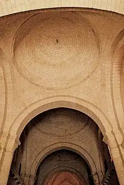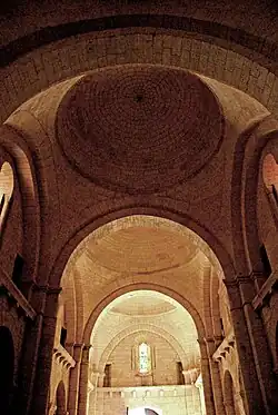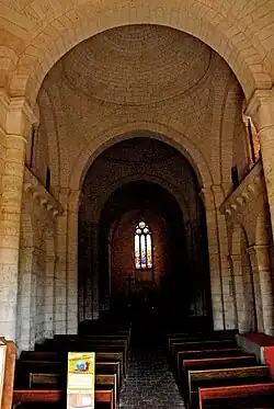 Das Schiff und seine Verlängerung unter den Turm besteht aus insgesamt vier gleichen Jochen, mit kreisrunden halbkugelförmigen Pendentifkuppeln, die in der Romanik wohl statisch intelligenteste und interessanteste Einwölbung großer Spannweiten. Da bei diesen Kuppelkonstruktionen die Lasten der Gewölbe unabhängig von den Außenwänden auf eigene kräftige Pfeiler übertragen und in die Fundamente abgeleitet werden, lässt die Gestaltung der inneren Wandflächen tiefgründig und damit sehr lebendig erscheinen. Die dicken Pfeilerbündel unter den Ecken der Pendentifs setzen sich aus Rechteck- und Halbrundpfeilern zusammen. Von deren Kapitellbündeln gehen Gurtbögen aus, jeweils einer über das Schiff hinweg, und quer dazu zwei im Querschnitt gestaffelte, leicht angespitzte Rundbögen, entlang den Außenwänden.