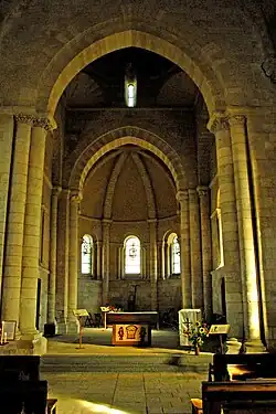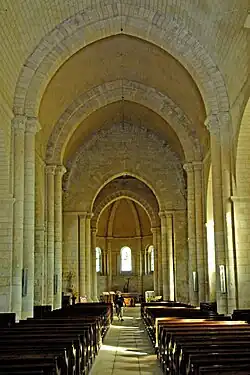Die Kirche Saint-Nicolas hat heute noch ein vollkommen romanisches Innere, ohne jeden Umbau in gotischer Zeit. Das Langhaus ist dreischiffig, mit abgesenkten Seitenschiffen und mit fünf Jochen. Das Tonnengewölbe und die Bögen sind leicht angespitzt, und zwar bei den Gurten, Jochen und der Vierung, auch beim Triumphbogen zum Chor. Lediglich die Fenster werden von Rundbögen ohne Knick überdeckt. Die Gurtbögen im Mittelschiff haben hohe und abgestufte Querschnitte und lassen sie sehr wuchtig erscheinen. Die Steine der Bögen wechseln in den Farbnuancen hell mit dunkel ab. Die Stützen des Schiffs sind rechteckig und entsprechend der Wanddicke breit, und auf der Innenseite mit Bündeln aus drei Rundsäulen verstärkt, auf dem die kräftigen Gurtbögen ihre Lasten abtragen. Die archaischen Kapitelle sind in die Frühromanik einzustufen. Es gibt kein Querschiff. Die Vierung wird unmittelbar durch die seitlichen Fenster der Vierungsaußenwand belichtet. Weiter oben über dem Triumphbogen gibt es noch ein ganz winziges Fenster und eine Kuppel mit gefächerten Trompen. Der Chor ist halbrund abgeschlossen und mit einem Kreuzrippengewölbe überdeckt, dessen Rippen aber in schwerer romanischer Art.