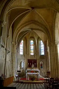 Im südlichen Chorwinkel erhebt sich der von großen Maßwerkfenstern durchbrochene, mit einem Schieferdach gedeckte Glockenturm. Seine Ecken werden von mehrfach abgetreppten Strebepfeilern begrenzt. Der Chor, der in eine polygonale Apsis mündet, wird ebenfalls von Maßwerkfenster durchbrochen. An seiner Südseite ist eine kleine Kapelle mit einem Eckturm angebaut. Im Innern öffnen mächtige Arkaden das Hauptschiff zum südlichen Seitenschiff. Sie werden von Säulenbündeln getragen, die mit floralen Kapitellen verziert sind.