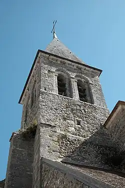 An der Westfassade erhebt sich der Glockenturm, der in drei Bauphasen errichtet wurde. Im Unterbau des Turms, der ins frühe 11. Jahrhundert datiert wird, öffnet sich ein Rundbogenportal. Der Mittelteil, der zwischen 1080 und 1000 entstand, ist mit schmalen, schießschartenartigen Öffnungen versehen. Das obere Stockwerk des Turms, das aus der ersten Hälfte des 12. Jahrhunderts stammt, wird auf allen vier Seiten von rundbogigen Zwillingsarkaden durchbrochen.