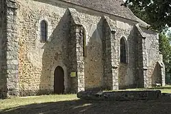 In den Giebel der ansonsten schmucklosen Westfassade sind zwei Rundbogenfenster eingeschnitten. Das Westportal wird ins 12. Jahrhundert datiert. Es ist von Archivolten umgeben und wird von zwei Säulen gerahmt, die mit Volutenkapitellen verziert sind. Auf dem linken Kapitell ist eine Figur mit erhobenen Armen dargestellt, auf dem rechten Kapitell sind Fratzen zu erkennen.