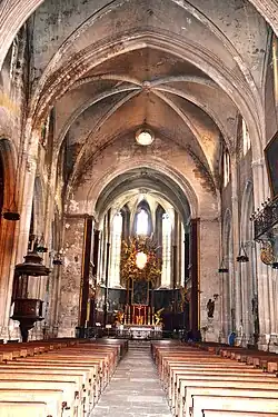 Nachdem das Kirchenschiff des romanischen Vorgängerbaus eingestürzt war, wurde ab dem Jahr 1404 eine neue Kathedrale im gotischen Stil gebaut. Die unvollendete Westfassade enthält zwei große Glasfenster aus dem 15. Jahrhundert; augenfällig sind die zwischen 1615 und 1618 ausgeführte Verkleidung des oberen Teils und der neugotische Glockenturm. Das Kirchenschiff, das von Strebepfeilern gestützt wird, zwischen denen Seitenkapellen eingebaut sind, wird durch einen schmaleren und niedrigeren Chor und eine siebenseitige Apsis verlängert, ein bemerkenswertes Beispiel für die südfranzösische Gotik. Beachtenswert ist das spätgotische Südportal.[2]
