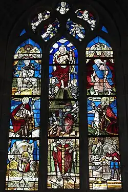 Das Fenster mit Szenen der Auferstehung Christi wurde 1862 aus Scheiben verschiedener Fenster wieder neu zusammengesetzt. Die Scheiben des Maßwerks mit der Darstellung Gottvaters und vier Engeln wurden um 1525 bis 1530 geschaffen. Die drei Lanzetten werden in die zweite Hälfte des 16. Jahrhunderts datiert. In der Mitte steht Christus über seinem Grab, neben dem die schlafenden Wächter liegen. Die untere Szene zeigt einen Diakon. Die linke Lanzette stellt oben den heiligen Edern auf einem Hirsch reitend dar, in der Mitte einen Bischof und darunter den heiligen Nikolaus, der in einem Schiff sitzt und versucht, das Meer zu besänftigen. Auf der rechten Lanzette sieht man oben einen Pilger, vielleicht den heiligen Rochus oder den Apostel Jakobus, in der Mitte den heiligen Théleau (Thélo) auf einem Hirschen und unten das Wunder des heiligen Eligius, der einem Pferd sein abgehacktes Bein wieder ansetzt.