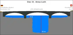 Bereits rund 700 Meter oberhalb der Brücke im Bereich des Höllhakens beginnen sich die ersten Furchen in das Flussbett des Rheins einzugraben. Diese kleineren Furchen verlaufen in Fließrichtung und schließen sich mit der Zeit zu immer größeren Gräben zusammen. Rund 100 Meter oberhalb der Alten Rheinbrücke vereinen sich die zwei letzten Gräben zu einem mächtigen, steilwandigen Graben, der direkt unter dem mittleren Abschnitt der Brücke zwischen Inseli mit der ehemaligen Burg Stein und dem rechten Rheinufer hindurch verläuft. Unmittelbar nach der Rheinbrücke öffnet sich der Graben in ein ausgedehntes, muschelförmiges Becken, dessen tiefster Punkt das St.-Anna-Loch bildet.[1] Im Jahr 2023 wurde bekannt, dass das St. Anna-Loch neu vermessen wird.[2]