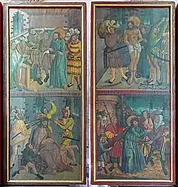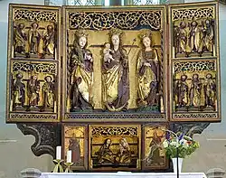 Der spätgotische Flügelaltar von 1510/15 ist ein Triptychon mit einem beweglichen Flügelpaar, das zwei Schauseiten ermöglicht. Das Altarretabel steht auf einer Predella, deren Mittelschrein ebenfalls mit einem Flügelpaar verschlossen werden kann, aber zusätzlich noch über ein Paar Standflügel verfügt. Ist das Retabel geschlossen, sind vier Gemälde aus der Passion Christi zu sehen: Christus vor Pilatus, Geißelung, Dornenkrönung und Kreuztragung Christi. Die vier bemalten Flügel der geschlossenen Predella zeigen die Heiligen Erasmus, Eustachius, Georg und Leodegar. Das geöffnete Retabel enthält Schnitzfiguren vor einem goldenen Hintergrund. Im Mittelschrein steht Maria als Mondsichelmadonna mit dem Jesuskind, flankiert von der heiligen Katharina von Alexandrien mit Palme auf einem Rad (links), und der heiligen Margarete auf einem Drachen (rechts). Auf den Flügeln sind in Dreiergruppen die 12 Apostel dargestellt. Im Mittelschrein der offenen Predella ist als Schnitzwerk die heilige Anna selbdritt eingefügt. Auf den Flügeln befinden sich Gemälde der Heiligen Apollonia von Alexandria mit Zange und Zahn (links) und Dorothea mit einem Körbchen mit Blumen (rechts). Der Altar wurde 1922 restauriert.[16]