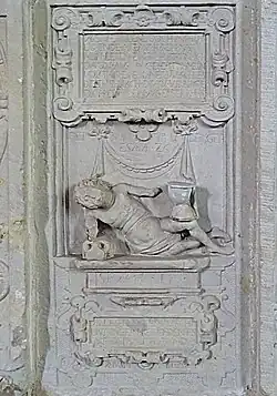 An der Chornordwand ist neben dem Triumphbogen ein Obelisk von 1606 aufgestellt, der mit Vollwappenreliefs geschmückt ist, die den Stammbaum der Grafen von Mansfeld-Hinterort aus der Zeit von 1229 bis 1567 darstellen. Seine Fortsetzung findet der Stammbaum in einem Fries mit 32 Wappenschilden, der sich unterhalb des Gewölbeansatzes auf Renaissancegesimsen um den Chor herumzieht und von den sechs Fenstern in ebenso viele Abschnitte unterteilt wird. Unter jedem Friesabschnitt hängt ein großer runder Totenschild für einen Mansfelder Grafen, der im 16. oder 17. Jahrhundert in der Kirche bestattet wurde.[11]