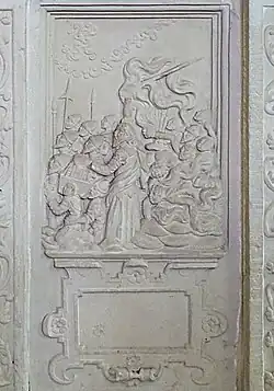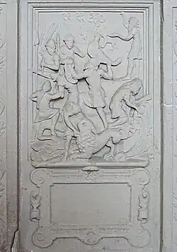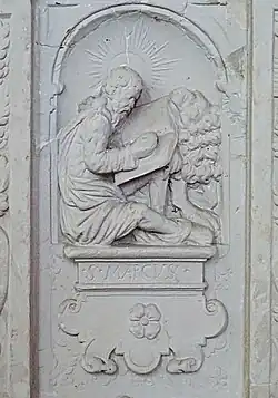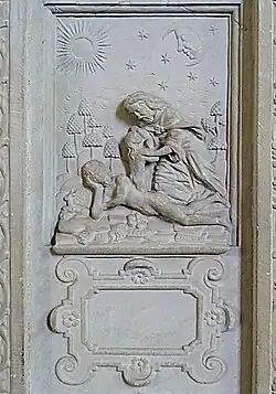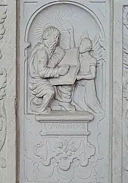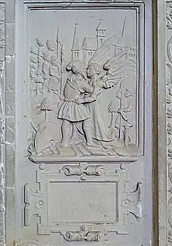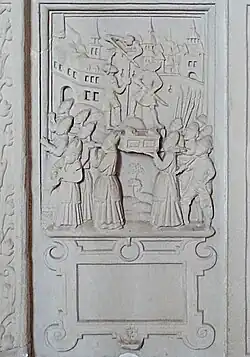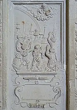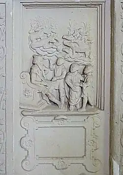 Die Reihenfolge der Darstellungen beginnt vorne an der Chornordwand mit dem Block mit zwei Feldern und verläuft im Uhrzeigersinn bis zum Sakristeieingang an der Südwand. Das erste Relief zeigt den mit dem Tod konfrontierten Menschen (Adam), das zweite die Auferstehung Christi. Die letzten vier an der Südwand sind den vier Evangelisten gewidmet, die mit ihren Symbolen abgebildet sind. Zwischen diesen Blöcken sind alttestamentliche Szenen eingefügt, die alle einen typologischen Bezug zu Christus haben.[12] Als Vorlage für sie benutzte Uttendrup Holzschnitte aus dem Buch von Virgil Solis: Biblische Figuren deß Alten Testaments / gantz künstlich gerissen. Franckfurt am Mayn 1562.[13][14]