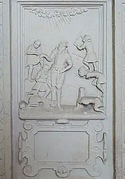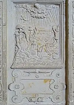 Die Bildfolge aus dem Alten Testament beginnt mit Szenen aus dem Buch Genesis: Auf die Erschaffung der Welt folgen die Erschaffung Evas, der Sündenfall, die Sintflut und Gottes Bundesschluss mit Noach. Die nächsten Bilder zeigen die Opferung Isaaks, Jakobs Kampf mit dem Engel, seinen Traum von der Himmelsleiter und den Untergang von Sodom und Gomorra. Nach dem Verkauf Josefs nach Ägypten ist er mit der Frau des Potifar zu sehen und deutet dann die Träume des Pharaos, indem er für Ägypten sieben fruchtbare Jahre, gefolgt von sieben Hungerjahren prophezeit. Zum Buch Exodus gehören folgende Motive: Durchzug durch das Rote Meer, die Speisung der Israeliten mit Wachteln und Manna, Aaron als Hohepriester, der Tanz um das goldene Kalb und die Erhöhung der ehernen Schlange. Dem Buch Josua ist die Darstellung der Eroberung von Jericho entnommen. Die restlichen Reliefs sind aus dem Buch der Richter: Jaël tötet Sisera, Gideon wählt Männer für den Krieg gegen die Midianiter aus, Simson kämpft gegen die Philister, trägt die Stadttore von Gaza weg und stirbt, indem er ein Haus zum Einsturz bringt und so auch die feiernden Fürsten der Philister mit in den Tod nimmt.[15]