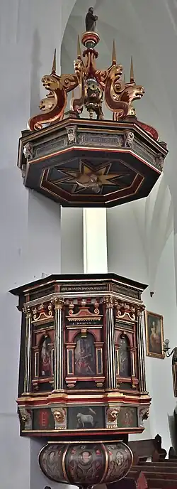 Die bemerkenswerte Kanzel entstand 1594. Sie trug einst Bilder von Jesus Christus, Paulus von Tarsus und Martin Luther. Im Jahr 1994 sind hier wohl Bilder von Luther und Philipp Melanchthon angebracht worden. Dazu gibt es Darstellungen der Evangelisten. Der einstige Hochaltar steht jetzt rechts vom Chorraum. Er entstand 1862 und zeigt das Gemälde „Christus am Kreuz“ (1870/71) von Ludwig Rosenfelder, dem ersten Leiter der Kunstakademie Königsberg. Es wurde nach dem Krieg mit finanzieller Unterstützung ehemaliger Rastenburger restauriert. Die Orgel ist ein Werk von Johann Josua Mosengel von 1721. An der Orgelempore links gab es das Geweih eines Sechzehnenders mit geschnitztem Kopf. Viele der einst zahlreichen Grabplatten von Pfarrern und Bürgern des 16. bis 18. Jahrhunderts sind nicht mehr vorhanden, auch nicht die mit der ältesten Stadtansicht von Rastenburg des Bürgers Friedrich Spiller, der, gerade zum Bürgermeister gewählt, 1625 der Pest zum Opfer fiel. Die Seuche grassierte damals in der ganzen Stadt und soll 2500 von 3200 Einwohnern das Leben gekostet haben, wie eine Tafel, die sich einmal neben der Taufe befand, bekundete.[3] Im westlichen Teil des rechten Schiffes sind drei Grabplatten eingemauert; die interessanteste stammt aus dem Jahr 1597 und stellt Oberst Schenk dar, den Kommandanten der Stadtwache. Was sonst an Epitaphien gerettet werden konnte, befindet sich teils im Rastenburger, teils im Museum für Ermland und Masuren. Das silberne Taufbecken wurde 1738 von der Familie Hippel gestiftet. Es ist erhalten und steht in der Kirche.