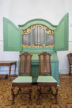 Ein Chorportal[11] aus der Zeit zwischen 1505 und 1525 trennt das Langhaus vom Chor. Auf ihm erhebt sich die Kreuzgruppe (der Leib Christi und die Kreuzinschrift INRI sind auf Vorder- und Rückseite des Kreuzes angebracht). Links und rechts die Statuen der Maria und des Johannes. Den Altarraum dominieren barocke Elemente: Der Hauptaltar mit einem 1712 datierten Gemälde des Gekreuzigten von D. Oberdorff, die Kanzel und die zehn Gebetsstübchen der Konventualinnen[12] aus der Zeit zwischen 1711 und 1717. Neben dem Hochaltar an der Ostwand ragt das um 1450 entstandene spätgotische Sakramentshaus 4,5 Meter in die Höhe. An den Wänden rund um den Altar hängen die Totenschilde der verstorbenen Konventualinnen. Verschiedene Plastiken und Gemälde, von den Stiftsdamen gestiftet, schmücken die Wände der Kirche, darunter eine spätgotische Maria im Strahlenkranz und ein Bartholomäus aus gleicher Zeit.