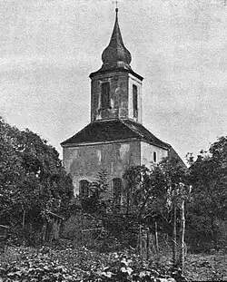 Die im Jahre 1908 abgerissene Fachwerkkirche in Oschätzchen