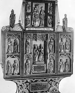 Großer Flügelaltar mit Figuren, in der Mitte die Krönung Mariä zwischen Barbara und Katharina links, Katharina und einer Heiligen mit Nadel rechts (Ursula?); in den Flügeln links oben Magdalena und Johannes Evangelist, unten Dorothea und Martin, rechts oben Urban und ein unkenntlicher Bischof, unten Laurentius und Antonius. Im Aufsatz ein Bischof mit Kirche, ein solcher mit Buch und Kreuz, Helena, Maria mit Kind, Jakobus der Ältere, ein Bischof und eine Heilige, Bonifazius.[9]