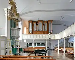 Der Innenraum aus dem 18. Jahrhundert ist zum größten Teil erhalten geblieben. Die Saalkirche hat einen mittigen, spätbarocken Kanzelaltar, der an drei Seiten von einer frühklassizistischen Empore umgeben ist. Über der Kanzel ist ein goldener Strahlenkranz mit Engelsdarstellungen zu sehen, in dessen Mitte in hebräischer Schrift die vier Buchstaben des Gottesnamens ׳הוה (JHWH) zu lesen sind. Die vier südlichen Fenster zeigen die Geburt, Taufe, Kreuzigung und Auferstehung Jesu. Sie wurden im Jahre 1930 von Georg Karl Ernst Rohde (1874–1959) geschaffen. Ebenfalls aus dem 20. Jahrhundert (1961) stammen das bronzene Altarkreuz und der Taufstein; beide wurden von dem Worpsweder Künstler Ulrich Conrad (* 1930) angefertigt. Anstelle eines Kruzifixes hat Conrad ein Auferstehungskreuz geschaffen: Der auferstandene Jesus ist nicht mehr am Kreuz zu finden.