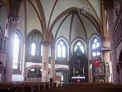 Hase entwarf die Kirche in den Formen der norddeutschen Backsteingotik mit reicher Gliederung und vielfältigem Zierrat. Baumaterial sind in verschiedenen Farben lasierte Ziegel. Der geostete Bau ist eine dreischiffige Hallenkirche, deren Seitenschiffe durch gemauerte Emporen in zwei Stockwerke geteilt sind. Den Ostabschluss des vierjochigen Langhauses bilden zwei nur angedeutete Querarme sowie der Altarraum, alle polygonal schließend. Über dem kathedralartig gestuften und mit Flankenbauten betonten Westportal erhebt sich der massive quadratische Turm mit Ecktürmchen und farbig ornamentierter Kegelspitze.