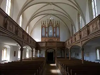 Im Inneren der Kirche findet sich ein kreuzrippengewölbter Emporensaal. Den Übergang zum Chor bildet ein mit drei Öffnungen versehener Triumphbogen. Seine Bauweise täuscht eine Dreischiffigkeit des Bauwerks vor. Die bauzeitliche Ausstattung der Kirche wurde überwiegend aus Lindenholz gefertigt. Dazu zählt unter anderem eine Hufeisenempore, welche in die beiden seitlichen Spitzbogenöffnungen des Triumphbogens mündet. Im Westen wurde die Empore polygonal ausgeführt. Dort dient sie als Standort der Orgel. Rechterhand des Mittelteils des Triumphbogens ist eine Kanzel aus Sandstein mit hölzernem Schalldeckel zu finden. Ebenfalls aus Sandstein besteht das Taufbecken. Das im Chor befindliche Altarbild, welches den auferstandenen Christus zeigt, wurde mit einem spitzbogigen Holzrahmen umfasst.[4][1]