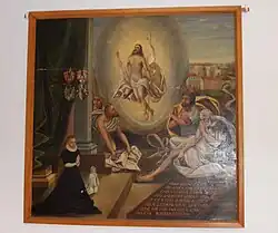 Weiters findet sich an der Kirchwand ein Gefallenendenkmal des Ersten Weltkriegs, das als Metallplatte in Kirchenwand eingelassen wurde.[1] Auf dem sich der Kirche anschließenden Friedhof ist ein weiteres Gefallenendenkmal für die Opfer des Zweiten Weltkriegs in Form eines mehrere Meter hohen Holzkreuzes und eines davor befindlichen Findlings. Außerdem ist hier eine Kriegsgräberanlage des Zweiten Weltkrieges für hier in den Endkämpfen gefallene deutsche Soldaten zu finden.[11]