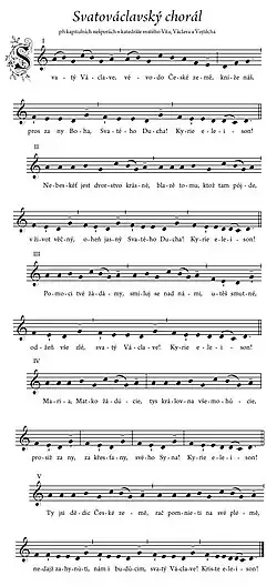 Der ursprüngliche Hymnus hat drei fünfzeilige Strophen, die jeweils mit dem Ruf Kyrie eleison enden. Es ist eine schlichte Fürbitte an den heiligen Wenzel, den Patron und Schutzheiligen Böhmens, damit er vor Gott für sein Volk eintrete, um es vor dem Bösen zu retten und ihm Heil zu geben. Nach dem Hymnus Hospodine, pomiluj ny ist es das zweitälteste musikalische Denkmal Böhmens. Ursprünge des St.-Wenzels-Chorals liegen in der slawischen Liturgie des 12. Jahrhunderts, in einer Zeit als der Wenzelskult schon stark verbreitet war. Beiden Liedern ist der Ruf Kyrie Eleison am Ende jeder Strophe gemeinsam. Der St.-Wenzels-Choral ist aber musikalisch und textlich ausgereifter als das ältere Hospodine, pomiluj ny.[1]