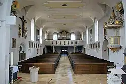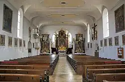 Der Innenraum des Langhauses ist mit einer Flachdecke überspannt, die von Vouten gerahmt wird. Die Kirchenausstattung ist zum Teil noch barock, ansonsten klassizistisch. Auf dem Altarretabel des Hochaltars ist die Heilige Familie dargestellt. Die ihn flankierenden Statuen zeigen den heiligen Petrus und den heiligen Paulus. Im Altarauszug ist Ägidius zu sehen. Der 1783/84 gebaute Tabernakel wird dem Bruder von Christoph Luybl zugeschrieben.