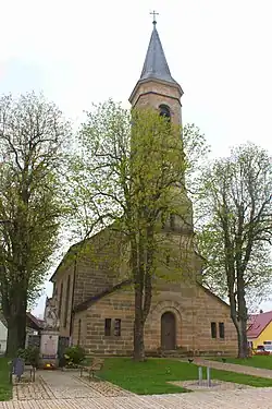 Die 1878 fertiggestellte Saalkirche ist im Nordwesten des Ortes zwischen der Friedhofstraße und der Bayreuther Straße im Stil der Neuromanik errichtet. Am Grundriss der Kirche mit kleinen Altarraum und Sakristei hat sich gegenüber dem Vorgängerbau nichts geändert. Der neue Turm musste von Grund aus neu gebaut werden. Das Gotteshaus aus roten Sandsteinquadern wird von einem Satteldach bedeckt. Die Langseiten werden durch Rundbogenfenster belichtet. Die Westseite ist fensterlos und hat zwei Fensterblenden. Dazwischen ist eine kleine halbrunde Apsis angebaut. Ein Gedenkstein an der Südwand erinnert an die der Vorgängerkirche von 1798.[1]