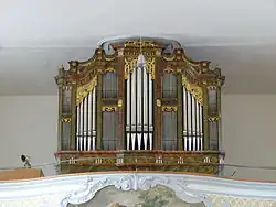 Wann die erste Orgel eingebaut wurde, lässt sich nicht mehr nachvollziehen. Im Jahre 1708 wird die erste bekannte Orgel eingebaut, sie wird im Jahre 1779 renoviert. Im Jahr 1822 wird ein neues Werk eingebaut, das vermutlich (keine Belege vorhanden) wieder ersetzt wird. Von den Gebrüdern Hindelang aus Ebenhofen wird die heutige Orgel im Jahr 1907 eingebaut. Dazu wird das vorhandene, historische Gehäuse vergrößert. Im Ersten Weltkrieg (1917) muss die Kirchengemeinde die Pfeifen aus Zinn abliefern. Als Ersatz werden Pfeifen aus Aluminium eingebaut. Im Jahr 1974 wird die Orgel durch Zeilhuber aus Altstädten überarbeitet. Die Traktur wird von pneumatischem Antrieb auf elektrischen Antrieb umgebaut, ein freistehender Spieltisch wird errichtet. Die Orgel hat 650 Pfeifen, organisiert in 14 Registern, verteilt auf zwei Manuale und das Pedal mit einem Tonumfang von C1 bis f5.[27]