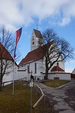 Die Saalkirche wurde im Kern im 15. Jahrhundert erbaut. Sie besteht aus einem Langhaus, einem eingezogenen, halbrund geschlossenen Chor im Osten, einer Vorhalle im Westen, die beide um 1700 errichtet wurden, einem Chorflankenturm an der Südwand, dessen untere Geschosse vom um 1200 gebauten Vorgängerbau stammen, und der Sakristei an der Nordwand des Chors. Der Chorflankenturm wurde 1738 mit einem Geschoss aufgestockt, das hinter den als Triforien gestalteten Klangarkaden den Glockenstuhl mit vier Glocken beherbergt, und quer mit einem Satteldach bedeckt.