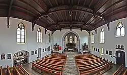 Neben dem Kirchturm in der südwestlichen Ecke zum Kirchenschiff steht ein Treppenturm. Das Langhaus und der Kirchturm werden von Wandvorlagen unterstützt. Das Langhaus wird von einer Flachdecke bedeckt, das Foyer im Turm und der Chor tragen ein Kreuzrippengewölbe. Die neugotischen Altäre stammen von Anton Becke aus Wiedenbrück. Im Chor steht ein Flügelaltar mit Reliefs über das Leben Christi, die Seitenaltäre sind Maria und Josef geweiht. Die Fenster im Chor zeigen figürliche Motive.