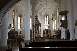 Der klassizistische Hochaltar wurde 1797 von Ignaz Ingerl geschaffen und 1890/92 verändert. Ein Gemälde von 1692 über die Beweinung Christi stammt von Johann Martin Veith. In den Apsiden befinden sich Epitaphien für die Grafen von Oettingen, die Johann Georg Bschorer 1720 ausgeführt hat. Die Orgel wurde 1869 von G. F. Steinmeyer & Co. gebaut.