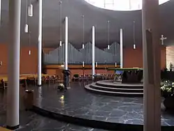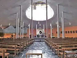 Im Zentrum des nahezu runden Kircheninneren steht ein Altar auf einer Insel unter der Glaskuppel. Der Boden ist mit schwarzen Steinfliesen gestaltet, die Wände in einem warmen Lachsfarbton gestrichen. In den Ausbuchtungen einer wellenförmig angelegten Wand schuf man Nischen, in denen Heiligenfiguren stehen. In der Taufkapelle unter dem Glockenturm steht ein Taufbrunnen aus rotem Sandstein. Die Kunstwerke stammen überwiegend aus den 1950er Jahren.[2]