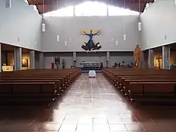 Das nach Westen ausgerichtete Kirchengebäude ist 37 m lang, 13 m breit und 13 m hoch. Neben der Kirche seht südöstlich etwas abseits freistehend ein schlanker Glockenturm dessen Höhe 45 m beträgt und mit einem 5 m hohen Bronzekreuz gekrönt ist. Der Innenraum umfasst 850 Sitzplätze. Westlich des Hauptgebäudes schließen sich Pfarrhaus, Pfarrheim und Kindergarten an.[1]
