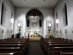 Die flachgedeckte Kirche wurde in jüngster Zeit neu gestaltet. Über dem Chorbogen hängt ein Kruzifix. Links und rechts neben dem Chorbogen sind Figuren der Muttergottes und des Kirchenpatrons Alfons Maria von Liguori angebracht. Die Orgel steht auf der östlichen Empore.