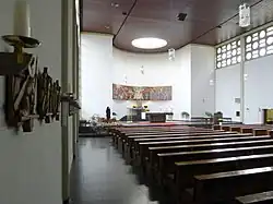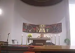 Vier Stufen führen in den erhöhten Altarbereich, fünf weitere zum Tabernakel. Der Altar war, entsprechend den Forderungen der Liturgischen Bewegung im Vorgriff auf die Liturgiereform des Zweiten Vatikanischen Konzils, von Beginn an freistehend vorgesehen. An der Wand der Apsis hängt ein Triptychon mit Szenen aus der Offenbarung des Johannes von Werner Persy. Persy schuf auch die drei Ölgemälde hinter der um zwei Stufen tiefer gelegten Taufkapelle im Eingangsbereich. Das Kirchengestühl und die Leuchten sind im Design der 1950er Jahre gestaltet.