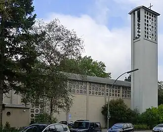 Der schlanke Campanile, der sich an die Längsseite der Schwyzer Straße anschließt, wiederholt diese Gestaltungselemente im Glockengeschoss, allerdings als Lochgitter geöffnet. Vier Gussstahlglocken, 1958 vom Bochumer Verein gegossen, hängen im Glockenturm.