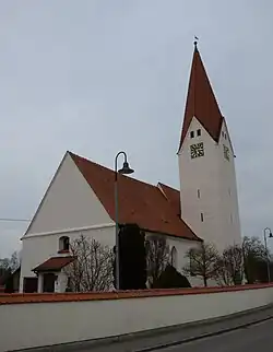 Die spätgotische Saalkirche besteht aus einem Langhaus, einem eingezogenen, dreiseitig geschlossenen Chor im Osten und einem Chorflankenturm auf quadratischem Grundriss an der Südwand des Chors, in dessen Giebeln die Zifferblätter der Turmuhr und darüber die Klangarkaden für den Glockenstuhl angebracht sind. Darüber erhebt sich ein spitzer Helm.