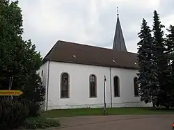 In den Jahren 1360 bis 1390 erfolgte der Bau der ersten Kirche, von der bis heute der Chorturm erhalten geblieben ist. Das Untergeschoss des Turmes beherbergte den Chorraum der Kirche. Der Turm wurde 1499 erhöht, das zeigt die Jahreszahl am oberen Schallloch der Nordseite. Im Jahr 1760 wurde die Kirchenschiff abgerissen und von 1760 bis 1763 durch eine barocke Saalkirche ersetzt. Die Pläne für den Neubau stammten vom herzoglichen pfalz-zweibrückischen Baudirektor Christian Ludwig Hautt. Für die Ausführung zeichnete Baumeister Bastian Arnold (Zweibrücken) verantwortlich[2].