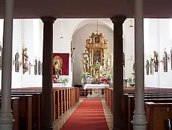 Chor und Langhaus werden von einem barocken Kreuzgewölbe überspannt, wobei die Jochtrennung im Langhaus mit Gurtbögen erfolgt. Die Wände sind durch Pilaster gegliedert. Den Übergang zwischen Chor und Langhaus vermittelt ein rundbogig veränderter Chorbogen. Im rückwärtigen Langhausjoch ist eine Orgelempore eingezogen. In der Sakristei befindet sich wiederum ein barockes Kreuzgewölbe. In der Mauerstärke zwischen Chor und Turm ist ein Zwischenraum zu finden. Dieser lässt darauf schließen, dass hier früher der Treppenaufgang zu den Obergeschossen des Turmes angeordnet war.[1]